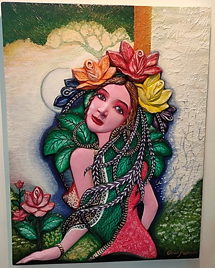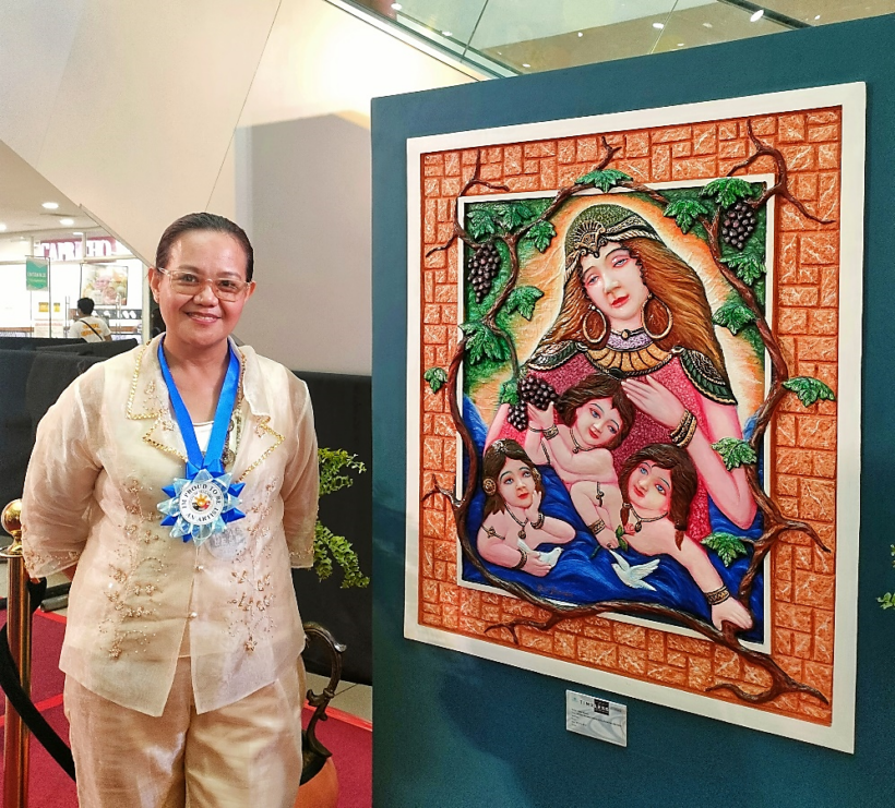 The interviewer and author Dr. Genevieve Balance Kupang with Elunio Faraon’s “Mother Egypt.” 2023. Mixed media. The three sons were described by the artist as representing three generations: Kupu (Prince; Heir to the throne), Kapra (Pure of heart/beautiful friend), Mocara (My Soul Friend).