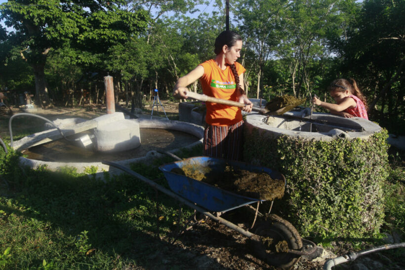 Next to the kitchen, two fixed-dome biodigesters contribute another renewable fuel, biogas, composed mainly of methane and carbon dioxide from the anaerobic decomposition of animal manure, crop waste and “even the black water from the house, which we channel so that this waste does not contaminate the environment,” Casimiro said.