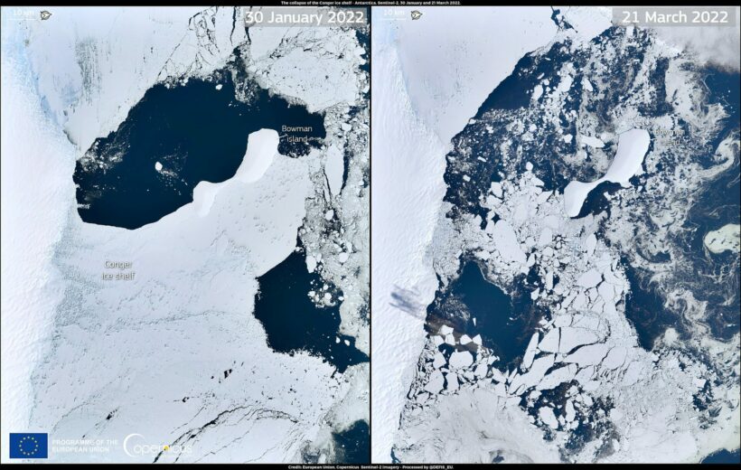 Within weeks, the unthinkable happened in East Antarctica. Conger Ice Shelf suddenly collapsed. According to NASA: “It is relatively common for ice shelves in Antarctica to spawn icebergs, it is less common for an ice shelf to completely disintegrate. The collapse has reshaped a part of the Antarctic landscape where coastal glacial ice was once thought to be stable. The change happened fast… All of the previous collapses have taken place in West Antarctica, not East Antarctica, which until recently has been thought of as relatively stable. This is something like a dress rehearsal for what we could expect from other, more massive ice shelves if they continue to melt and destabilize. Then we’ll really be past the turnaround point in terms of slowing sea level rise” (Source: Ice Shelf Collapse in East Antarctica, Earth Observatory, NASA, March 29, 2022).