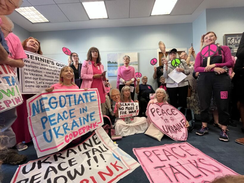 A group of 50 activists and Vermont constituents staged a sit-in inside Senator Bernie Sanders’ office on Wednesday, demanding the senator to call for peace and diplomacy in Ukraine instead of more weapons and war. The sit-in resulted in the arrest of 11 activists, including an 89-year-old CODEPINK peace activist.