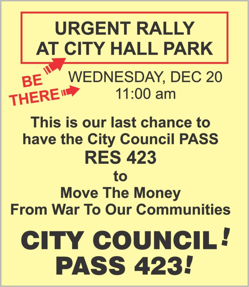 The Move the Money–NYC Coalition and Council Member Carlina Rivera will hold a rally in support of Resolution 423-2022 calling on Congress and the President to move significant funds away from the military budget to fund social services. It also calls for in-depth public hearings on the basic human needs of City residents that are unmet because of government appropriations for the Pentagon.