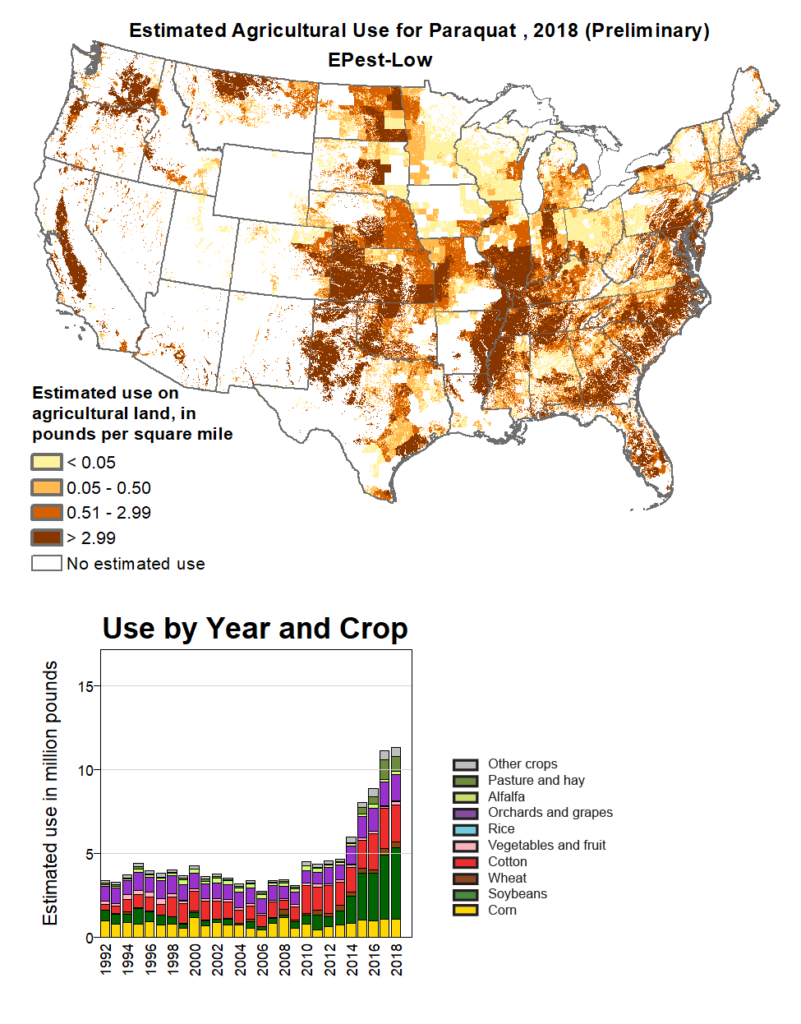 America seemingly has a special bond and unique love affair with paraquat. Usage in America tripled over the past decade. Accordingly, 8,000,000 pounds of it is sprayed on grapes, almonds, soya beans, cotton, corn, wheat, garlic, strawberries, rice, potatoes, artichokes, and pears especially prevalent in California, Iowa, and the Mississippi River Valley. (US Geological Survey source)