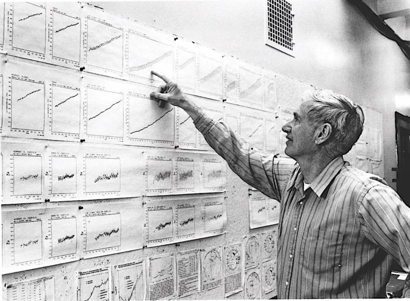 The data compiled in a paper by Keeling from 1956, “The Concentration and Isotopic Composition of Atmospheric Carbon Dioxide,” was funded by a grant from the Air Pollution Foundation. It shows how carbon emissions measurements Keeling took above tropical waters and at various U.S. locations were consistently similar and highlighted the broader scope of his research in predicting the effects of burning fossil fuels on the atmosphere.