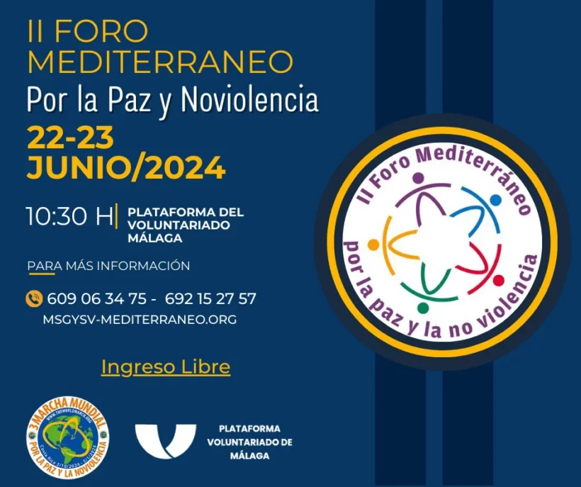 The 2nd Mediterranean Forum for Peace and Nonviolence, to be held in Malaga on 22 and 23 June 2024, represents a unique opportunity for individuals, organisations and movements committed to building a more just and non-violent society. This event is a continuation of the commitment initiated at the Mediterranean Nuclear Disarmament Forum in 2008 and is presented as a space for exchange and proposals focused on the methodology of active nonviolence.