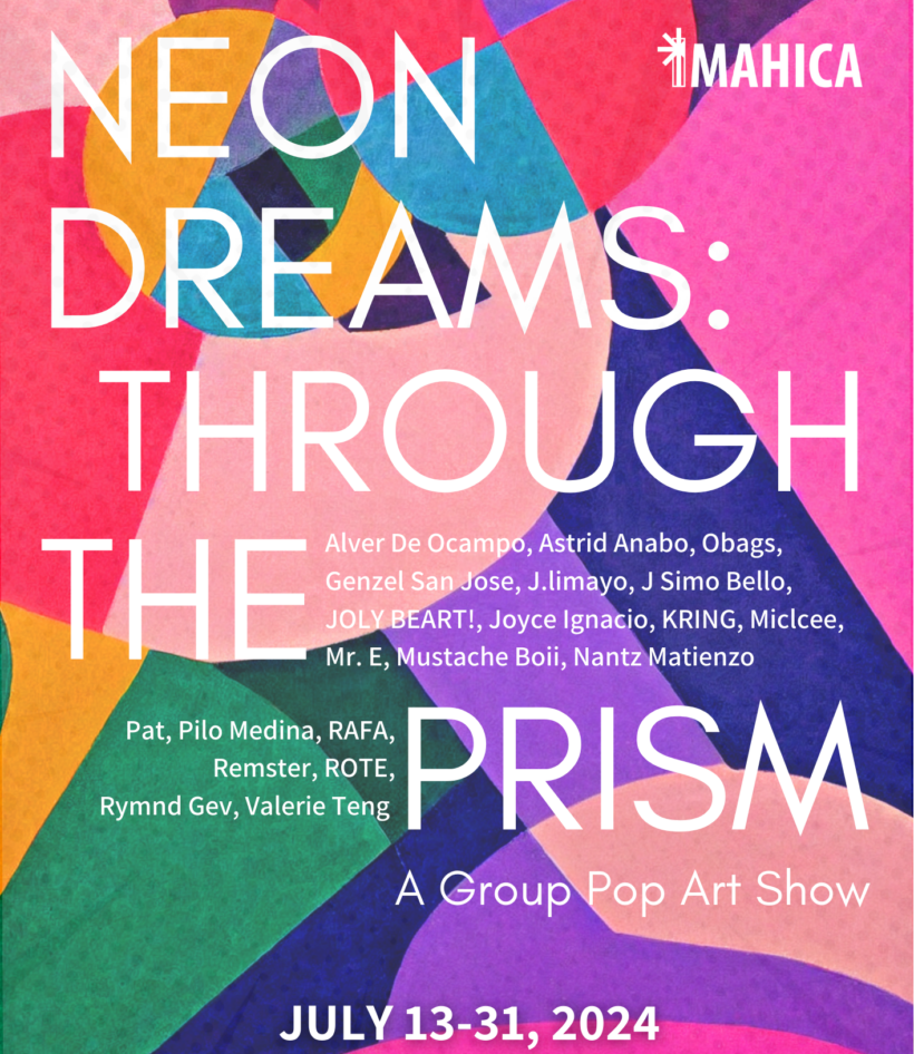 The “Neon Dreams: Through the Prism” is on view in the Imahika Art Gallery from July 13, to 31 2024. Participating artists include Alver De Ocampo, Astrid Anabo, Brike, Gabo Valenzuela (Obags),