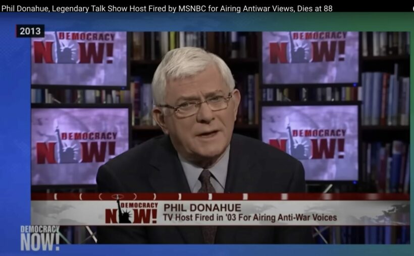 AMY GOODMAN: In 2003, Phil Donahue was fired from his primetime MSNBC talk show during the run-up to the U.S. invasion of Iraq. It was the most popular talk show on MSNBC at the time. The problem wasn’t Phil’s ratings, but rather his views. An internal MSNBC memo warned Donahue was a, quote, “difficult public face for NBC in a time of war,” providing a, quote, “home for the liberal antiwar agenda at the same time that our competitors are waving the flag at every opportunity,” unquote. In 2013, we spoke to Phil Donahue about his firing.