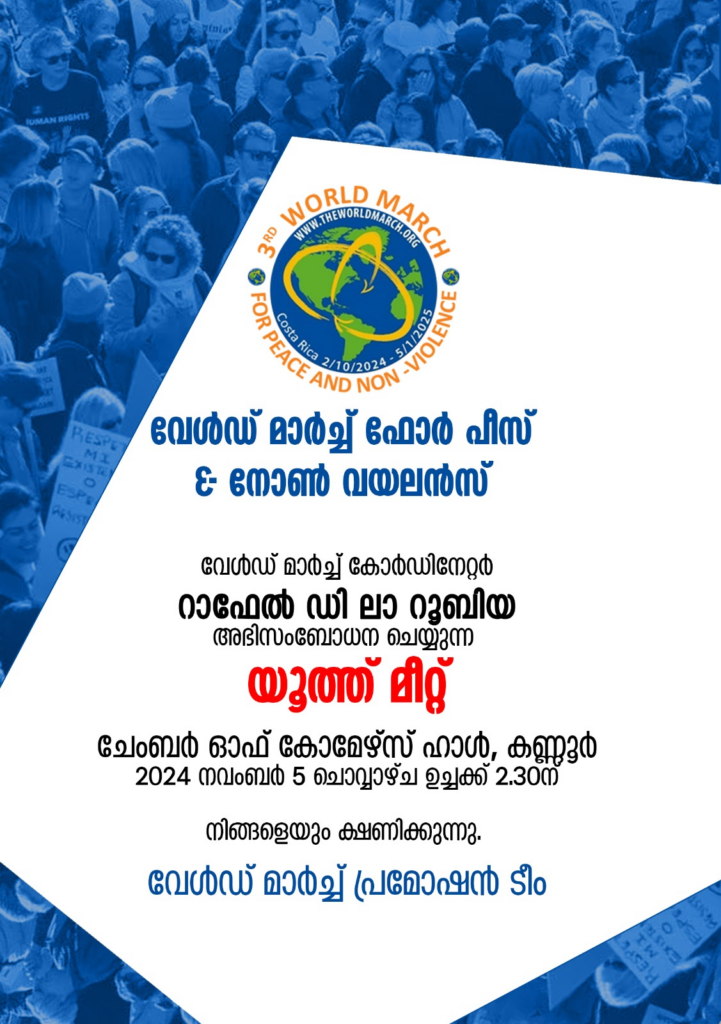 The third World March for Peace and Nonviolence, led by the organization World Without Wars and Violence, will reach Kannur on November 4-5 as part of its mission to promote peace and nonviolence. This march, which began in Costa Rica on October 2, 2024, will conclude again in Costa Rica on January 5, 2025.