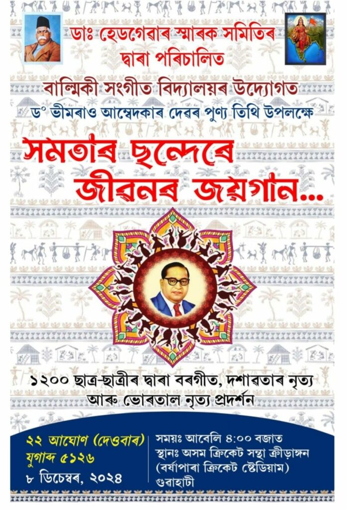 Guwahati: Assam Chief Minister Dr. Himanta Biswa Sarma will grace a spectacular cultural event, organized by Valmiki Sangeet Vidyalaya, on Sunday (8 December 2024) in the city. Titled Samatar Chandere Jivanar Joigaan (Joy of Living with Rhythm of Equality) , the program will begin at 4 pm in Barsapara’s Assam Cricket Association stadium. The Vidyalaya, run by Dr. Hedgewar Memorial Trust, has been organizing this annual event for the last few years with an aim to honor the revered architect of the Indian Constitution Dr Bhimrao Ramji Ambedkar (14 April 1891-6 December 1956) on his death anniversary.