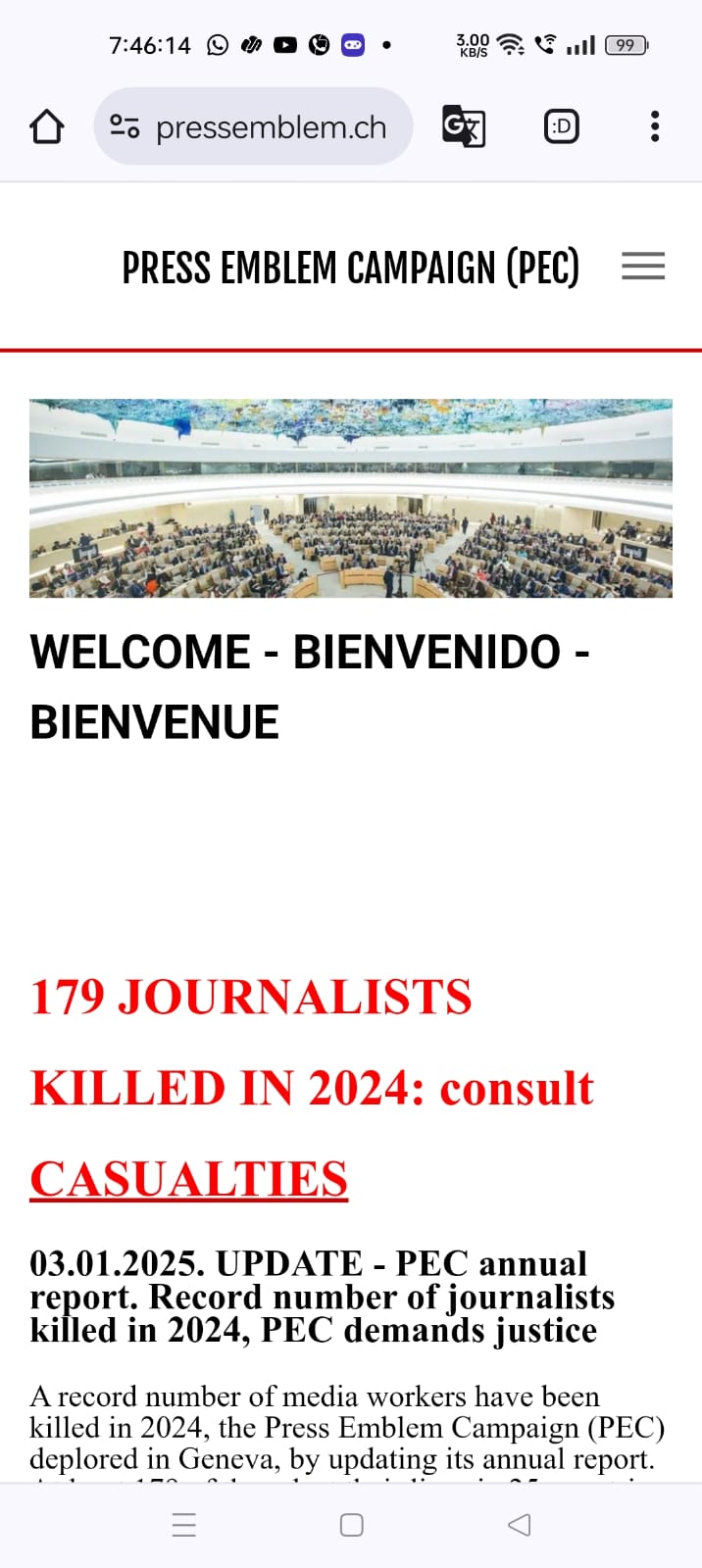 Geneva, 3 January 2025: A record number of media workers were killed last year, deplored the global media safety and rights body Press Emblem Campaign (PEC), citing that at least 179 of them lost their lives in 25 countries around … Continue reading Record Number of Journalists Killed in 2024, PEC Demands Justice
