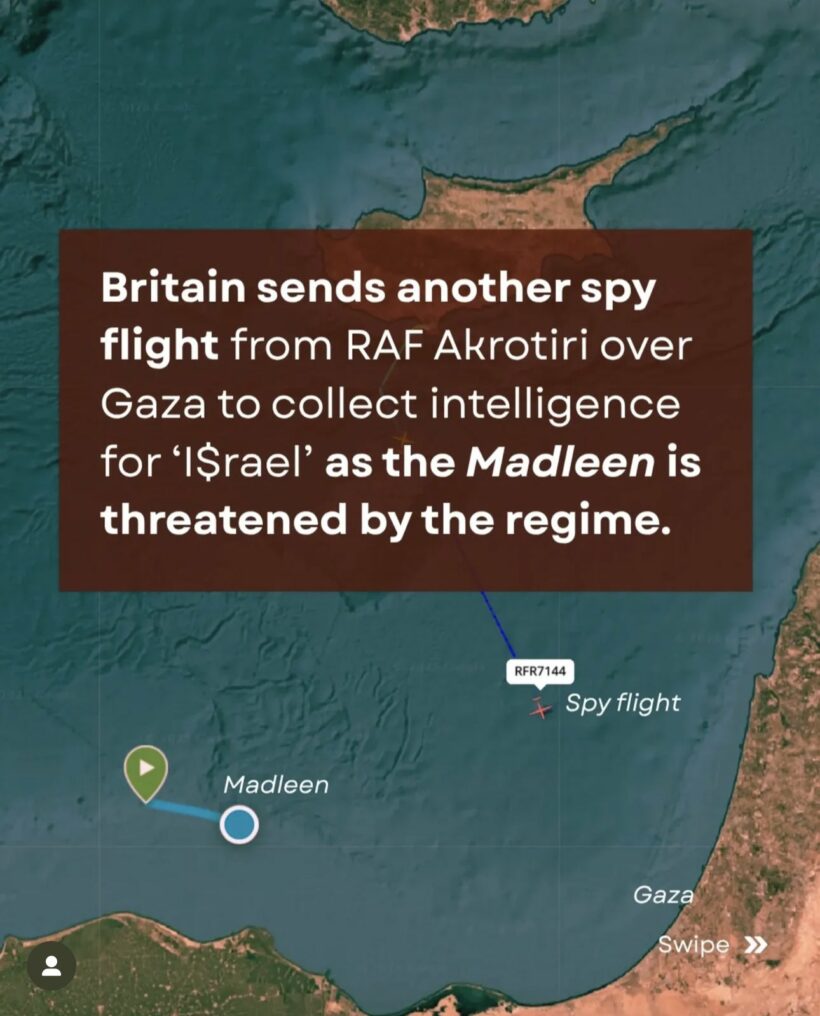 As the Gaza Freedom Flotilla approached Palestinian waters, a British spy flight took off from a British military base on Cyprus to surveil Gaza. Despite the recent narrative shift on relations with Israel, Britain remains deeply involved in the genocide of Palestinians, its efforts centred around its RAF Akrotiri military base on Cyprus, using it to launch these spy flights, which send intelligence, including targeting data, directly to the Israeli military. These bases are colonial relics, hosting American troops and intelligence agents, an affront to Cypriot sovereignty and a stain on Britain’s international standing; they must be shut down.