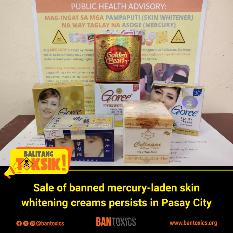 Toxics Watchdog BAN Toxics has issued a public health warning over the continued sale of banned skin-lightening products (SLPs) containing toxic mercury in beauty shops in Baclaran, Pasay City. The group is urging the local government to take immediate enforcement action.