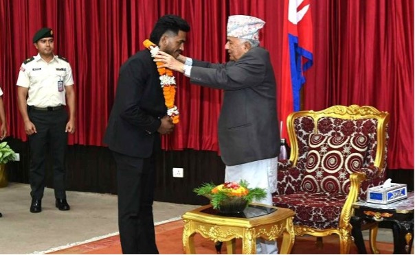 President Ramchandra Paudel honors Rabindra Dhant after his MMA triumph.