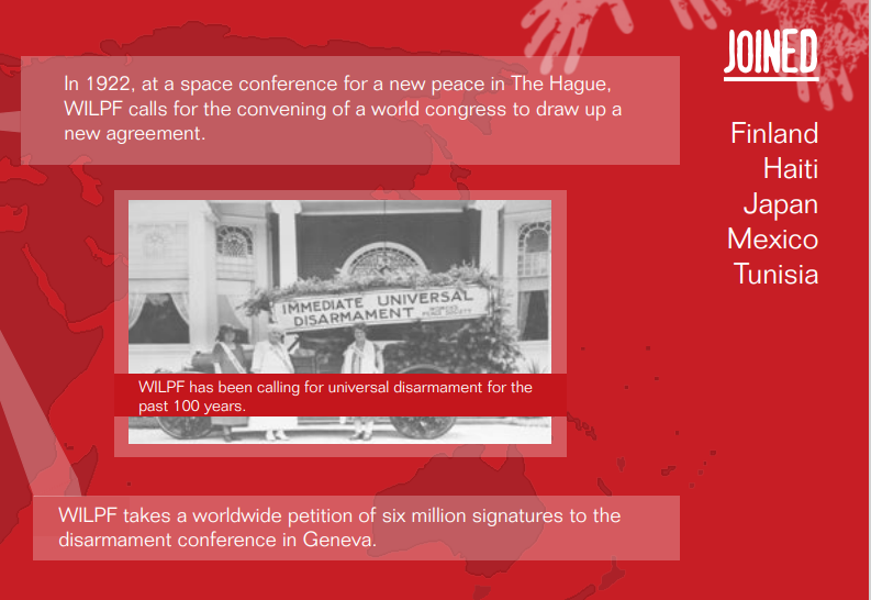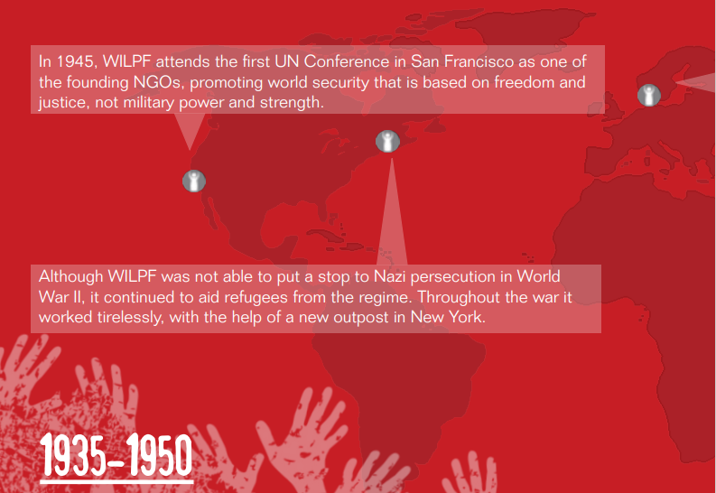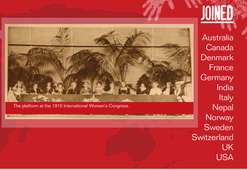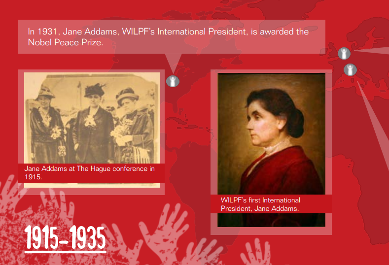 The first WILPF president, Jane Addams, had previously founded the Woman’s Peace Party in the United States, in January 1915, this group later became the US section of WILPF.