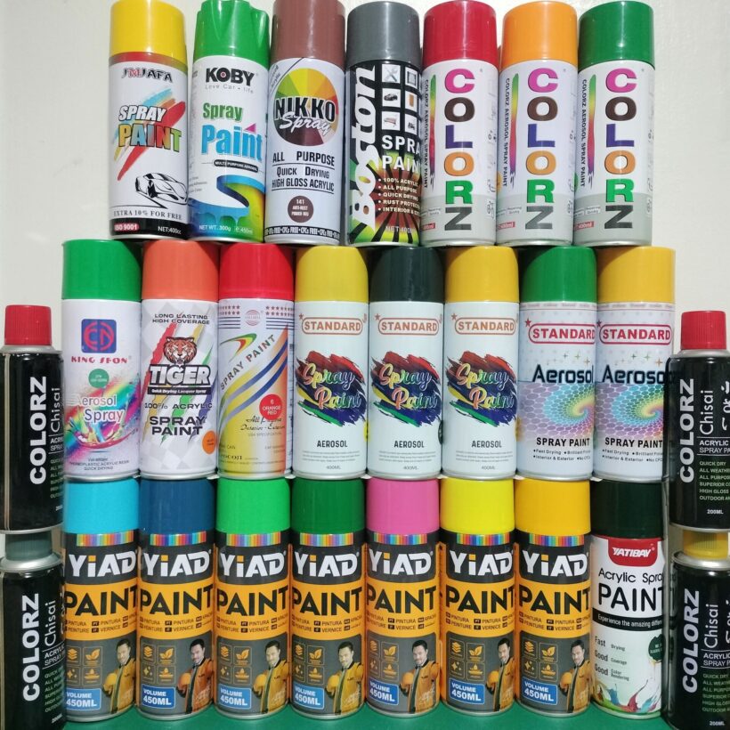 Colorz Chisai Acrylic Spray Paint: canary yellow (56,100 ppm), antirust brown (27,000 ppm), orange red (22,800 ppm), , medium gray (3,790 ppm);