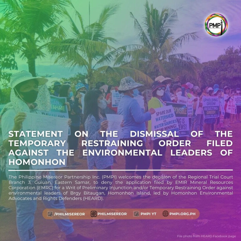 The Philippine Misereor Partnership Inc. (PMPI) welcomes the decision of the Regional Trial Court Branch 3, Guiuan, Eastern Samar, to deny the application filed by EMIR Mineral Resources Corporation (EMRC) for a Writ of Preliminary Injunction and/or Temporary Restraining Order against environmental leaders of Brgy Bitaugan, Homonhon Island, led by Homonhon Environmental Advocates and Rights Defenders (HEARD).