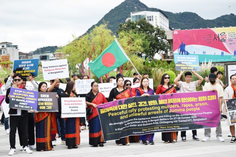 On 4 October 2025, the indigenous Jumma People of the Chittagong Hill Tracts living in South Korea organized a public rally in central Seoul against the attack and killing of their fellow people in southeastern Bangladesh by the Bangladesh Army on September 27-28, 2025.