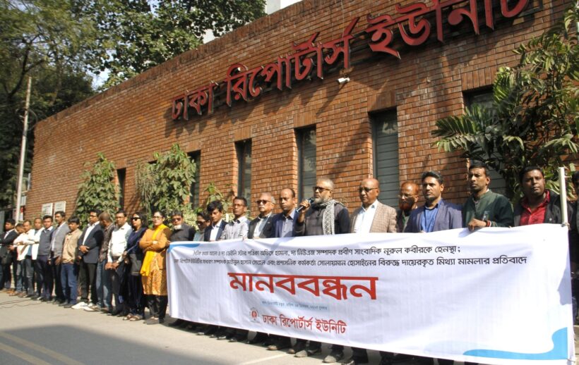 The Dhaka Reporters Unity (DRU) organized a human chain protest demanding the withdrawal of false cases filed against its General Secretary, Mynul Hasan Sohel, and Administrative Officer, Solaiman Hossain. The protest also condemned the public harassment of veteran journalist and The New Age Editor Nurul Kabir, as well as attacks on the offices of Daily Prothom Alo and The Daily Star.