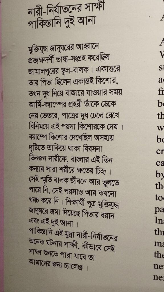 On the adjacent wall, a caption reads: ‘Following an appeal from the Liberation War Museum, a schoolboy from Jamalpur collected the testimony of an eyewitness of ’71. In 1971, his father was just a teenager. While going to the market with milk, a camp guard called him inside. They kept the milk and gave the boy this coin in exchange. Inside the camp, the boy saw ‘three naked women’ staring helplessly. There were wound marks all over the bodies of these three daughters of Bengal. The boy could never forget that memory. He never spent that coin. His student son has now submitted his father’s testimony and this two-anna coin to the museum. This Pakistani coin is a witness to an incident of violence against women; hearing that testimony is a challenge for us.’