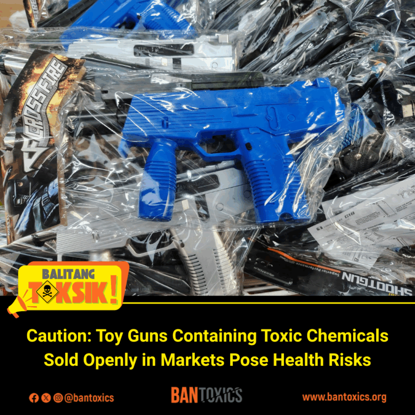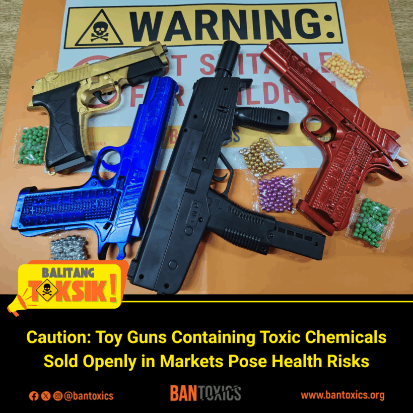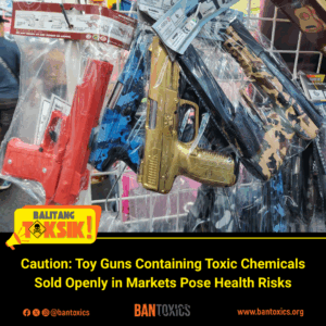 Toxics watchdog group BAN Toxics raises the alarm over the sale of dangerous firearm replicas, known as “pellet gun” toys, sold in ambulant stores in Baclaran, Pasay City, and Divisoria, City of Manila, and urges the FDA and LGUs to ban their sale and use to prevent injuries, hazards and chemical exposure among children.