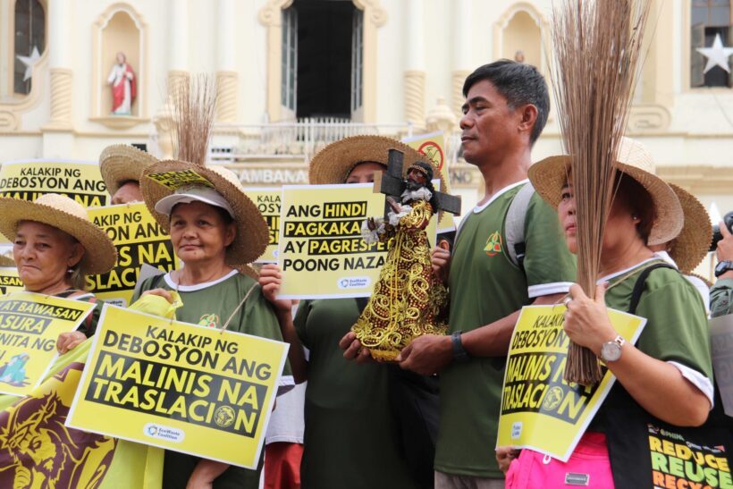 The group peacefully assembled not to protest but to make a timely plea for an ecological feast of the Black Nazarene as summed up in their banner: “Kalakip ng debosyon ang malinis na Traslacion.” The event concluded with the participants cleaning off litter around the church using broomsticks and flip flops.