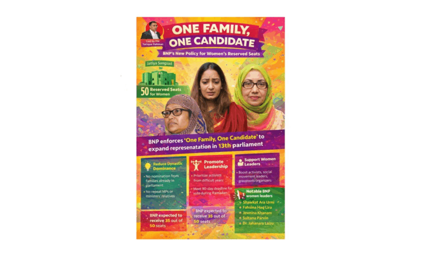 Bangladesh’s ruling Bangladesh Nationalist Party (BNP) has decided to enforce a ‘one family, one candidate’ policy in the allocation of women’s reserved seats in the country’s 13th parliament, a move party leaders say is aimed at widening representation and reducing dynastic dominance.