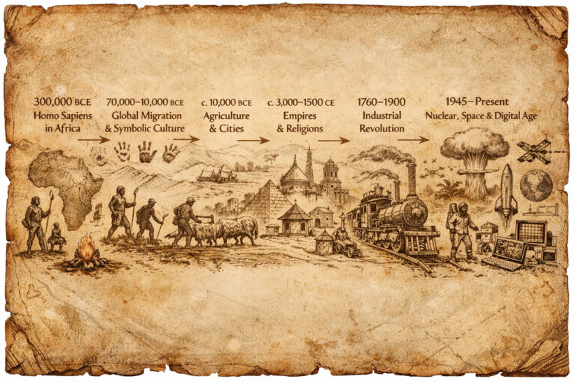 The gap becomes even clearer when we consider something far larger: human history itself. We can recite its milestones—300,000 BCE: Homo sapiens emerge in Africa; 70,000–10,000 BCE: global migration and symbolic culture; c. 10,000 BCE: agriculture and cities; c. 3,000 BCE–1500 CE: states, empires, religions; 1760–1900: the Industrial Revolution; 1945–present: the nuclear, space, and digital age—an era of planetary-scale responsibility.