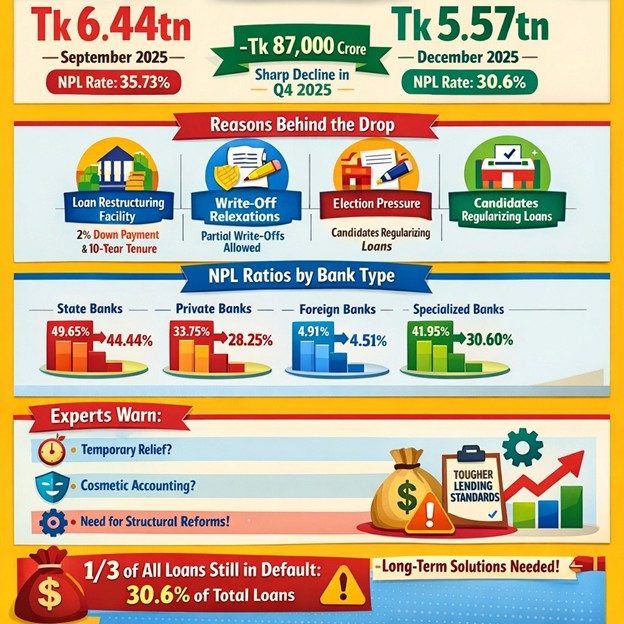 According to data from Bangladesh Bank, non-performing loans (NPLs) fell by nearly Tk87,000 crore between October and December. By the end of December 2025, total defaulted loans stood at approximately Tk5.57tn, equivalent to 30.6% of total outstanding loans.