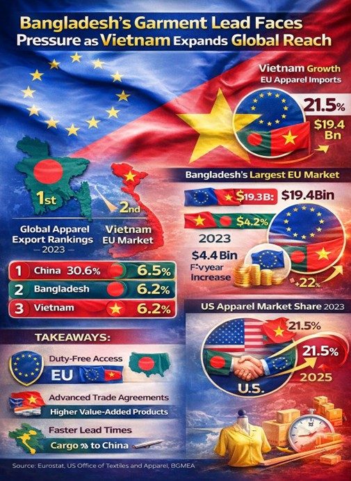 Globally, Bangladesh and Vietnam remain the world’s second and third-largest garment exporters after China. For the past four consecutive years, Bangladesh has retained the second position, largely supported by strong demand in the European Union market. Yet while Bangladesh maintains a strong foothold in Europe, Vietnam has established a commanding advantage in the United States, creating a two-front competition that could reshape the balance of power in the global apparel trade.
