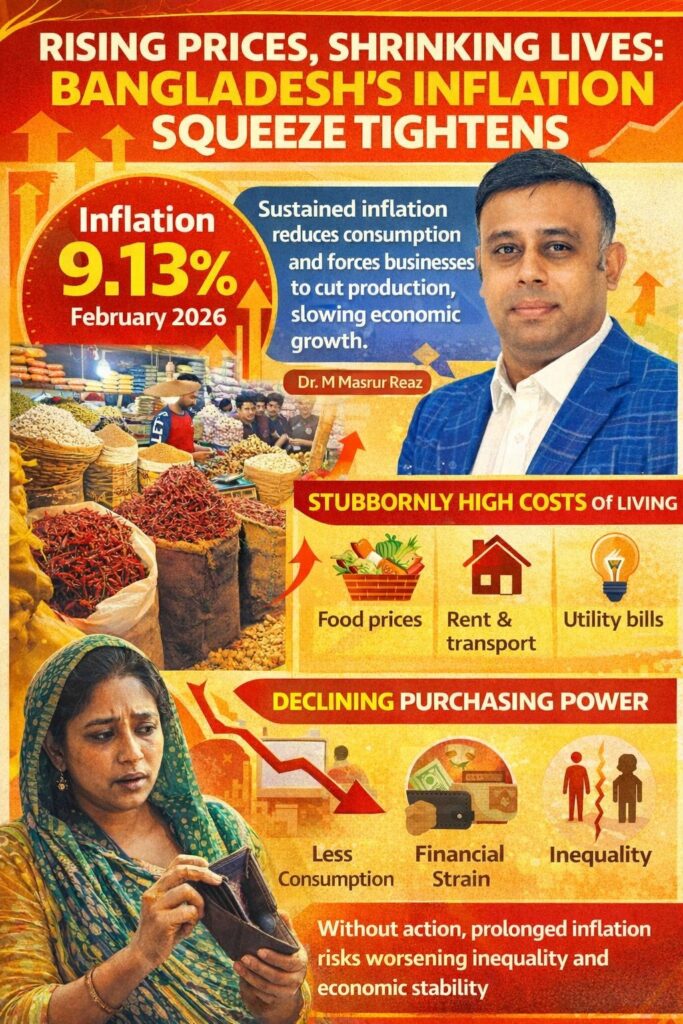 The cost of living in Bangladesh is rising once again- and with it, a growing sense of distress among ordinary people. Inflation has crossed the 9% threshold, reaching 9.13% in February 2026, according to the latest data from the Bangladesh Bureau of Statistics (BBS). Although slightly lower than the 9.23% recorded in February 2025, the figure still reflects persistent price pressure and signals continued hardship for households already struggling to cope.