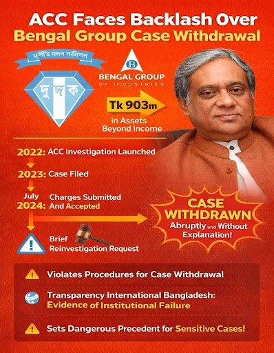 Bangladesh’s Anti-Corruption Commission (ACC) is facing mounting criticism after it abruptly withdrew a corruption case against Bengal Group chairman Abul Khair at the final stage before trial, raising serious concerns over the independence and integrity of the country’s anti-graft body.