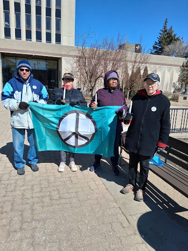 On Easter Monday, seven members of Regina’s Peace Council gathered in front of City Hall to light candles. The candles were electric because, as one of us said, City Hall’s courtyard is a wind tunnel!