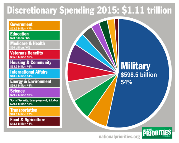 - 52% or $750 billion to the Military, and $989 billion, when you add in the budgets for Veterans Affairs, the State Department, National Security, Cybersecurity, National Nuclear Security and the FBI.