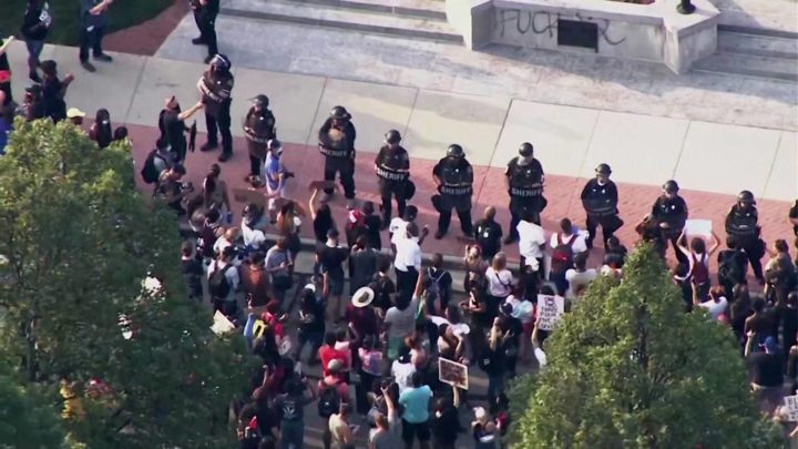 An officer shot Blake seven times in the back as he was getting into a car. His three children — ages 3, 5 and 8 — witnessed the shooting. Blake was reportedly trying to break up a fight between two women before the shooting, but the police have not explained why they went after him. He remained hospitalized in serious but stable condition Monday. Protesters defied a curfew Monday night as police used tear gas on crowds. Protests also took place across the country, including here in New York City.