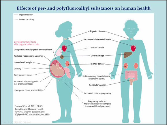Adverse health effects associated with exposure to PFAS include pregnancy-induced hypertension, immune suppression, liver and kidney damage, increased cholesterol, increased risk of thyroid disease, increased risk of asthma, decreased fertility, decreased birth weight and decreased antibody response to vaccines.