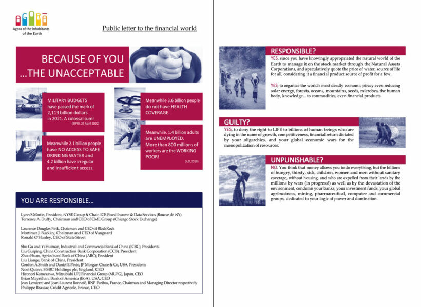 Our denunciation aims first of all to tell the dominant that they are directly responsible and personally guilty, and that it is not true that we must all individually and collectively change our actions and behavior to save the life of the planet and build social justice from below. It is too easy for them to argue such a thesis. It is up to them, instead, to stop being the lords and masters of the world, to dominate and impose their predatory choices and the defence of their own interests of power, domination and enrichment. Hence the title of the denunciation ‘Because of you… the unacceptable’. Secondly, it aims to share the fundamental principle of every democracy and justice system that considers that it belongs to citizens to rise up against the power that reigns, that discriminates, excludes, destroys common goods essential to life, does not respect universal rights, kills. As is manifestly the case with the current system.
