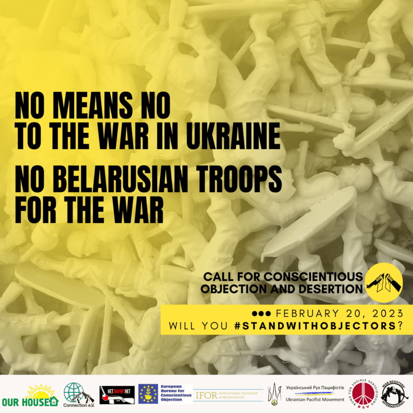 On the 20th of February 2023, we – Nash Dom, Ukrainian Pacifist Movement, Connection e.V., Federation for Social Defence, International Fellowship of Reconciliation, Agir pour la paix and War Resisters’ International – call for demonstrations outside Belarusian embassies across Europe. These protests will draw attention to the danger of Belarus joining Russia by sending military personnel to attack Ukraine.
