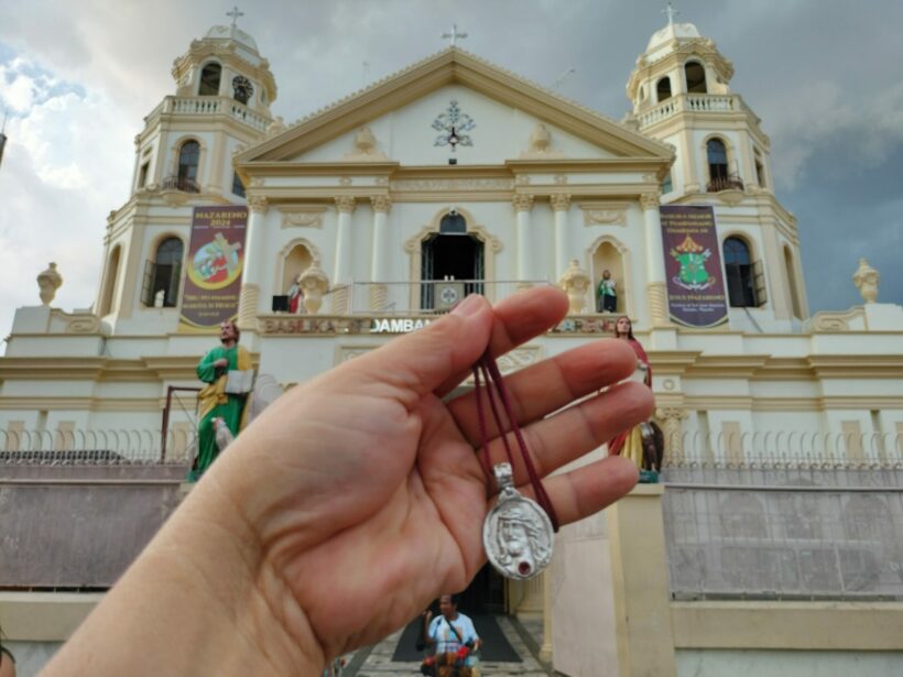 The Jesus Nazareno medallion with colorful prayer candles on sale outside Quiapo Church in the foreground.