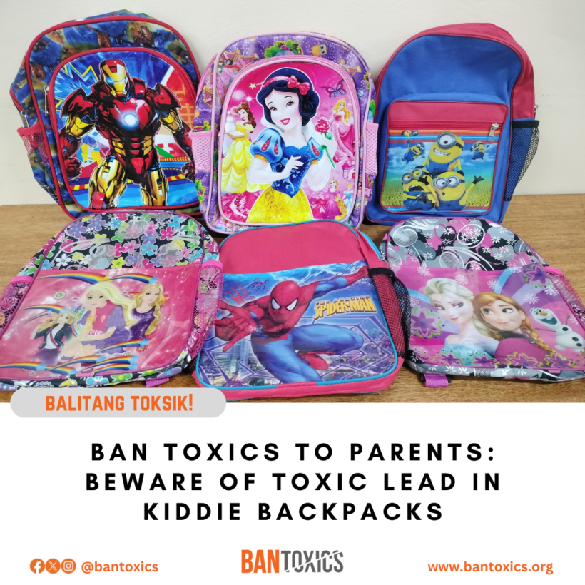BAN Toxics, a toxic and waste watchdog organization, sounded the alarm after discovering the presence of brain-damaging lead in some kiddie backpacks. Costing only P150 each, these colorful bags are sold in bargain stores and by sidewalk vendors in Divisoria, Manila.