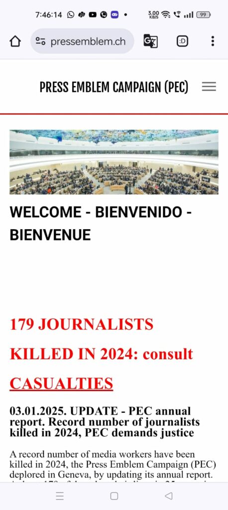 Geneva, 3 January 2025: A record number of media workers were killed last year, deplored the global media safety and rights body Press Emblem Campaign (PEC), citing that at least 179 of them lost their lives in 25 countries around the world in 2024.