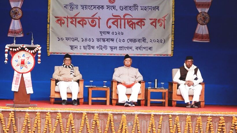 Guwahati, India: Rashtriya Swayamsevak Sangh (RSS) Sarsanghchalak Dr. Mohan Bhagwat, while gracing an intellectual (Bouddhik) program on Sunday morning, pointed out that the Swayamsevaks work as catalysts for the welfare of the society. Dr. Bhagwat commented that RSS is not a typical organization that inspires the Swayamsevaks to dedicate their time, energy, and space towards safeguarding Sanatan culture and the nation.