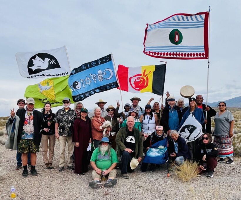 These amazing Americans walked, carrying placards calling for peace, led by the flag of the Western Shoshone Nation, held mile after mile by Jeremiah Jones, a strong, young leader of his people. One day they stopped the cars entering Creech AFB, the home of the Predator military drone; at the end of the week of walking, they stood at a broad white line on an arrow-straight, two-lane tar road that reached far into the desert belonging to the Shoshone – land taken over by the Department of Energy. They talked respectfully to the guards at the white line – they shook hands across the divide – a few stepped over and were arrested and soon released with a summons.