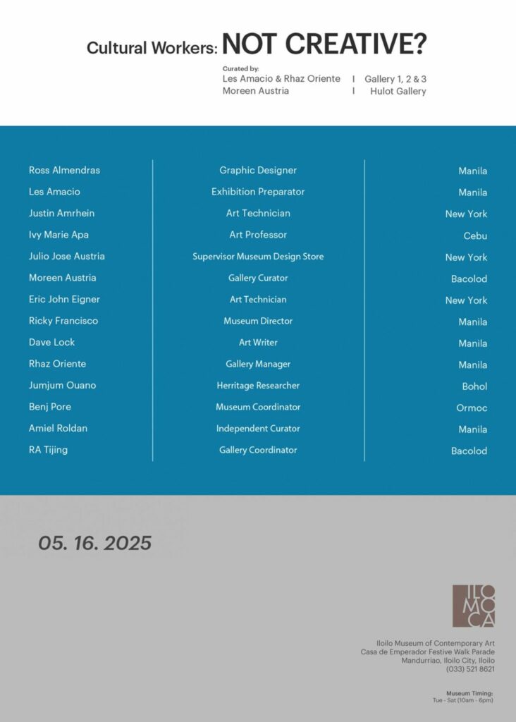 * Ilomoca presents “Cultural Workers: Not Creative?” on May 16, 2025. Opening and ribbon cutting starts at 6 PM at Ilomoca in Iloilo City. A series of events mark this momentous occasion, bringing together several artists of different backgrounds from different art peripherals in an exhibition. It is quite a novelty, now highlighing the cultural workers that normally work around in back offices, logistics, and the grounds of museums and galleries.