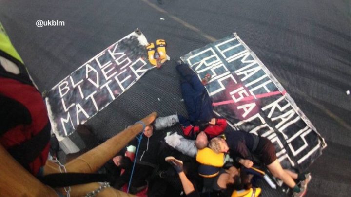 In Britain, the London City Airport shut down flights this morning after nine Black Lives Matter activists locked themselves together on the runway to protest the climate change impact of air travel on black people worldwide. In a series of tweets sent out by Black Lives Matter UK this morning, the group highlighted how many majority black nations in Africa are most impacted by climate change, even though majority white nations, like Britain, are most responsible for causing climate change. The protesters erected a tripod and chained themselves together, delaying flights for hours, before being arrested. This is a clip of a video put out by Black Lives Matter UK explaining the protest.