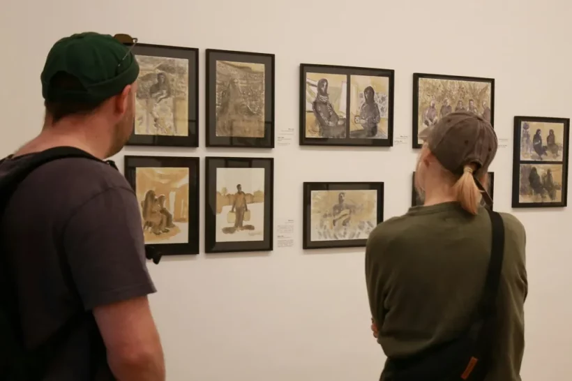 ويضمّ المعرض 79 لوحة مختلفة الأحجام باللونين الأسود والابيض، ورسومات على دفاتر مدرسية. واستخدمت في بعضها مواد بسيطة مثل أقلام الحبر الجاف، وعبوات أدوية، وأوراق قديمة، إضافة إلى أصباغ طبيعية كالرمّان والكركديه والشاي.