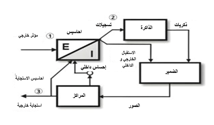 تبدأ العملية بوصول المحفزات الخارجية إلى الحواس (1)، ثم تمر إلى الذاكرة (2)، ثم إلى الوعي حيث تُنسق وتُركب على شكل صور ذهنية. انطلاقًا من هذه الصور، تُفعَّل مراكز الاستجابة وتصدر الاستجابة للعالم الخارجي. لكن في نفس الوقت، لدينا أجهزة ترصد تلك الاستجابة وترسل إشارات إلى الحواس الداخلية (3)، مما يمنحنا شعورًا بالاستجابة. كما أن نشاط مراكز الاستجابة نفسه يولّد إحساسًا داخليًا، وهذه الإشارات تعود بدورها إلى الذاكرة والوعي ليُعاد تحليلها وتركيبها كما يحصل مع بقية الإشارات.
