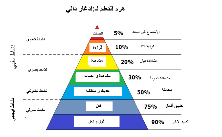 وقد أظهرت الدراسات أن التعلم السلبي في المحاضرات يُنتج معدل احتفاظ لا يتجاوز 5%، بينما تعطي قراءة الكتاب 10%. و هذا ما يوضحه “هرم التعلّم” الذي يبيّن نسبة الاحتفاظ بالمعلومة بعد أسبوعين بحسب طريقة التعلّم.