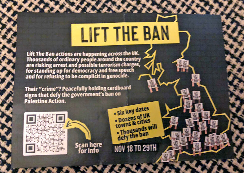 تندرج هذه الفعالية في إطار حملة .”Lift the ban“ (ارفعوا الحظر) التي تجري في الفترة من 18 إلى 29 نوفمبر في عشرات المدن والبلدات في جميع أنحاء المملكة المتحدة، متحدية حظر الحكومة البريطانية ومحذرة من أن ”آلاف الأشخاص العاديين في جميع الأنحاء البلاد معرضون لخطر الاعتقال ومواجهة تهم محتملة بالإرهاب، بسبب دفاعهم عن الديمقراطية وحرية التعبير ورفضهم التواطؤ مع الإبادة الجماعية“
