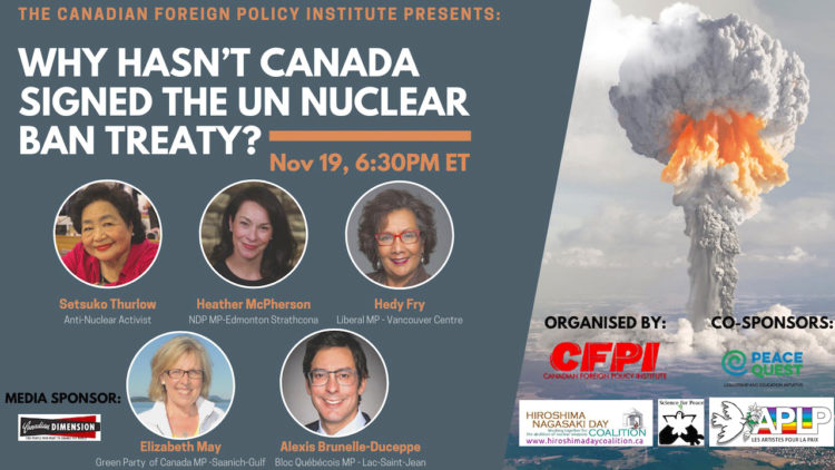 Join a webinar on the need for Canada to sign the UN Nuclear Ban Treaty, featuring Liberal MP Hedy Fry, NDP MP Heather McPherson, Green Party MP Elizabeth May, Bloc Québécois MP Alexis Brunelle-Duceppe as well as Setsuko Thurlow, survivor…