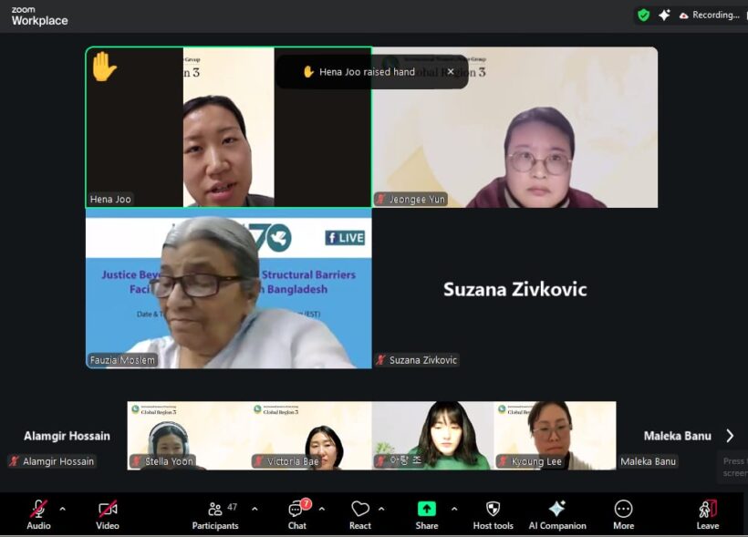 আন্তর্জাতিক উইমেন পিস গ্রুপ এবং নরডিক কনসালটিং গ্রুপের প্রতিনিধিদের অংশগ্রহণে এই অধিবেশনটি বাংলাদেশে নারীর মানবাধিকার রক্ষায় একটি শক্তিশালী নেটওয়ার্ক গড়ার অঙ্গীকারের মধ্য দিয়ে শেষ হয়।