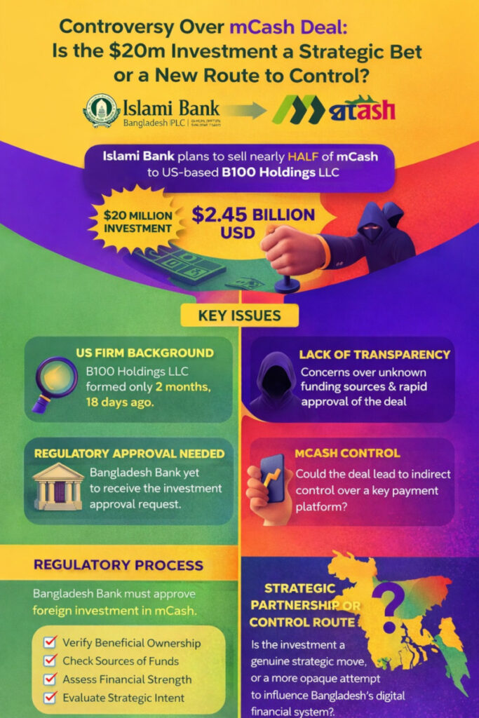 ইসলামী ব্যাংক বাংলাদেশ পিএলসি তাদের মোবাইল ফিন্যান্সিয়াল সার্ভিস ‘mCash’-এর প্রায় অর্ধেক অংশীদারিত্ব একটি স্বল্প পরিচিত মার্কিন প্রতিষ্ঠানের কাছে বিক্রি করার পরিকল্পনা করেছে। এই ঘটনা বাংলাদেশের আর্থিক খাতে ব্যাপক বিতর্কের জন্ম দিয়েছে। একই সাথে একটি গুরুত্বপূর্ণ ডিজিটাল পেমেন্ট প্ল্যাটফর্মের স্বচ্ছতা, নিয়ন্ত্রক সংস্থার তদারকি এবং ভবিষ্যতের নিয়ন্ত্রণ নিয়ে প্রশ্ন উঠেছে।
